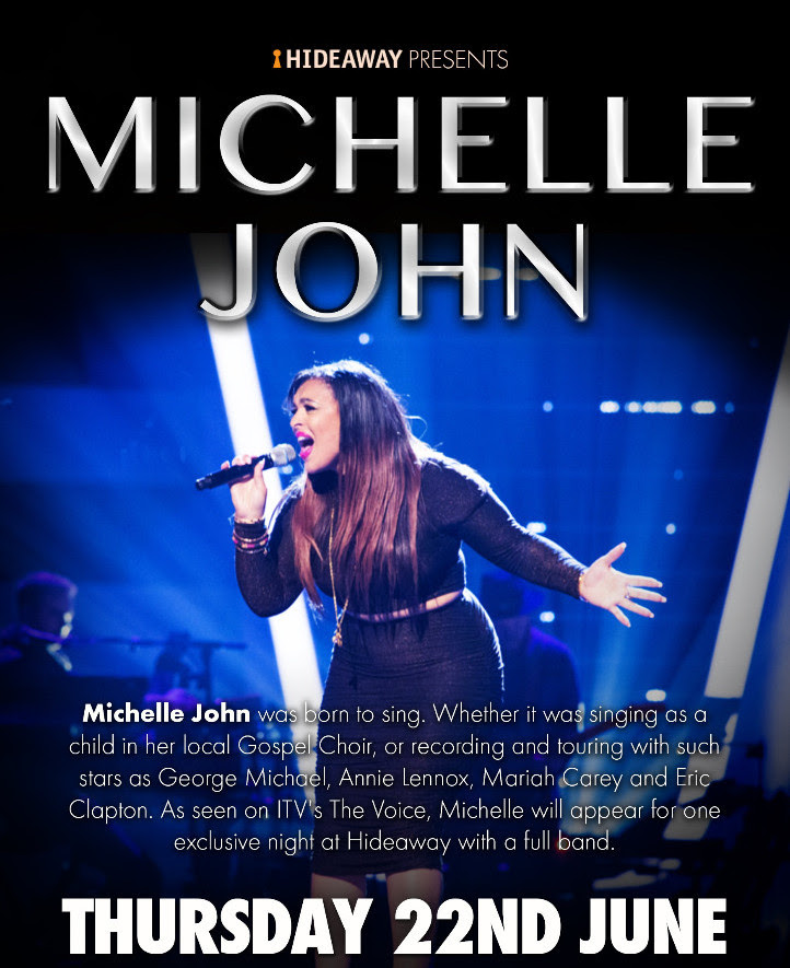 Michelle John was born to sing. Whether it was singing as a child in her local Gospel Choir, or recording and touring with stars such as George Michael, Annie Lennox, Mariah Carey and Eric Clapton. As seen on ITV's The Voice, Michelle will appear for one exclusive night at Hideaway with a full band led by Vince Dunn.