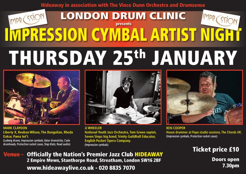 Hideaway in association with The Vince Dunn Orchestra and Drumsense presents The London Drum Clinic. Featuring Mark Claydon, JJ Wheeler & Ken Cooper.