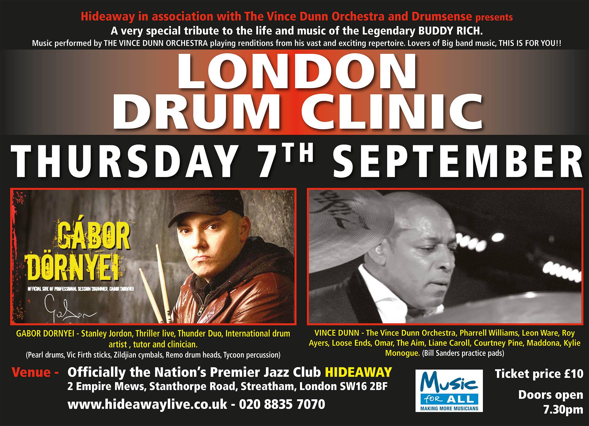 Hideaway in association with The Vince Dunn Orchestra and Drumsense presents A very special tribute to the life and music of the Legendary BUDDY RICH Music performed by THE VINCE DUNN ORCHESTRA playing renditions from his vast and exciting repertoire. Lovers of Big Band music, THIS IS FOR YOU!! Featring Gábor Dörnyei (Stanley Jordan, Thriller Live, Thunder Duo, International drum artist, tutor and clinician.) (Pearl