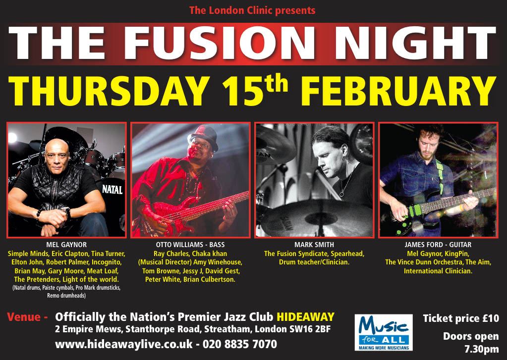 Hideaway in association with The Vince Dunn Orchestra and Drumsense presents The London Drum Clinic - The Fusion Night Featuring Mel Gaynor, Otto Williams (Bass), Mark Smith & James Ford (Guitar)