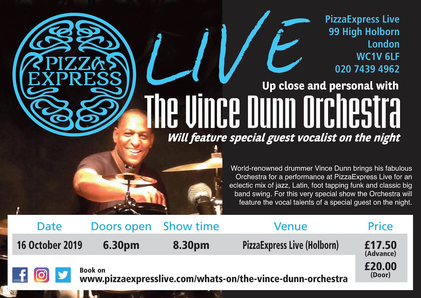 World-renowned drummer Vince Dunn brings his fabulous Orchestra for a debut performance at PizzaExpress Live for an eclectic mix of jazz, Latin, foot tapping funk and classic big band swing. £17.50 in advance or £20 at the door.
